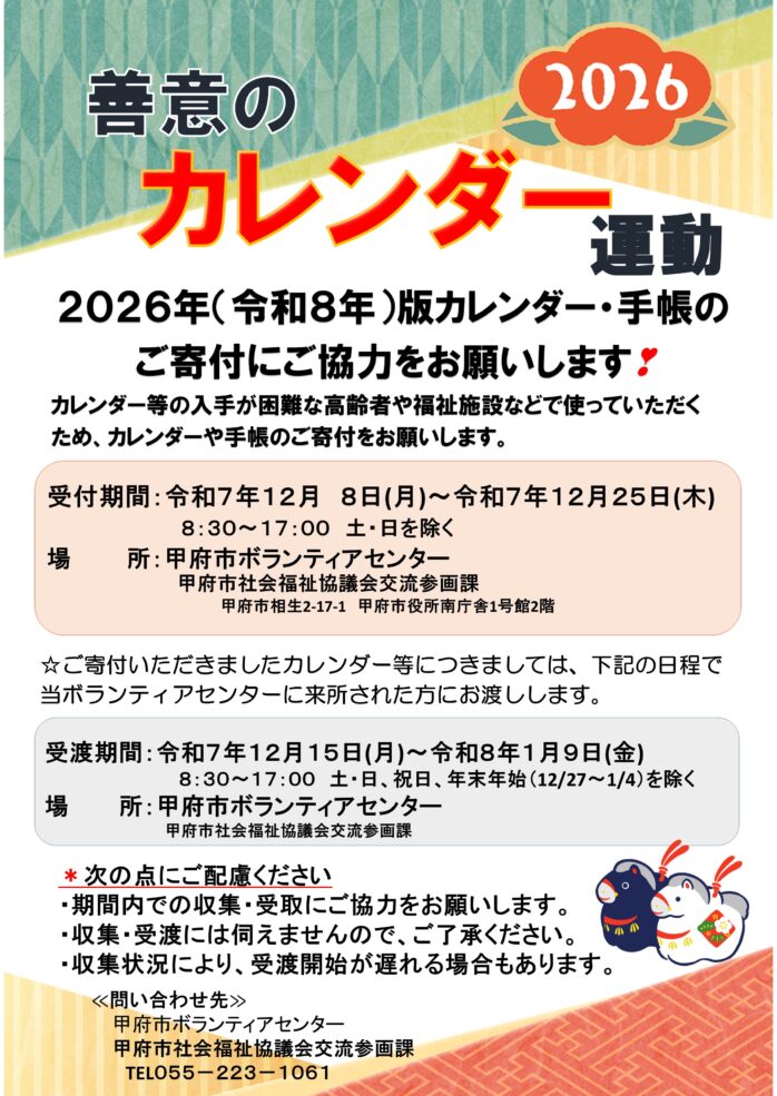 カレンダー等の入手が困難な高齢者や福祉施設などで使っていただくため、カレンダーや手帳のご寄付をお願いします。