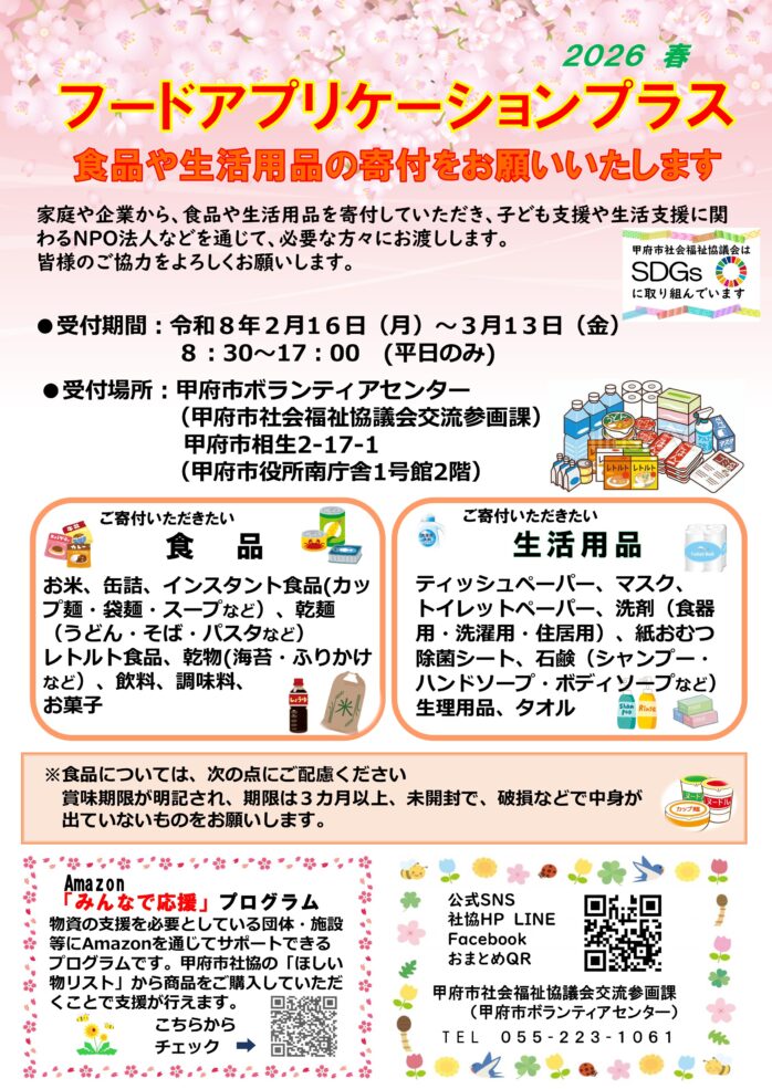 甲府市社会福祉協議会では、家庭や企業から、食品や生活用品を寄付していただき、子ども支援や生活支援に関わるNPO法人などを通じて、必要な方々にお渡しする取組として、「フードアプリケーションプラス」を実施しています。