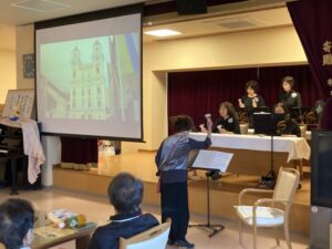地区内の高齢者の方を対象とした交流会が開催され、ハンドベル演奏や落語、ビンゴゲームなど笑顔溢れる催しを楽しみながら、参加者同士の交流を深めました。開催にあたっては地区内の福祉施設のご協力もあり、とても充実したひと時を過ごすことができたようでした。