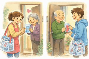 相生地区では、地区内にお住まいの75歳以上の方々を対象に、「歳末あったか事業」として、寒さ厳しい冬を少しでも暖かく過ごしていただけるよう、12月に靴下を贈呈しています。地域の方が各家庭を訪問してお渡しすることで、高齢者の皆さまの様子を直接うかがうことができ、安否確認の貴重な機会にもなっています。