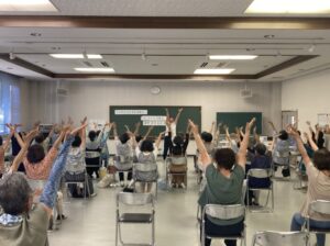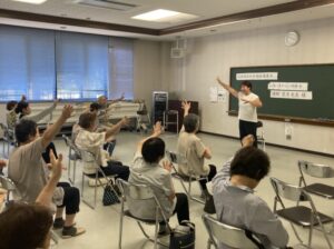 サロン活動の活性化を図るため、外部講師を招き、レクリエーション等のサロン活動に取り入れられるような内容の研修会を開催しています。今回は音楽に合わせて体を動かしたり、声を出したりするミュージックケアをとおしたレクリエーションを体験し、「椅子に座ったままでできる運動は参考になる」などの感想が聞かれるなど、とても有意義な時間となったようでした。