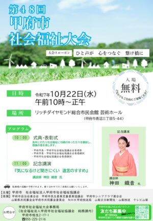 第48回甲府市社会福祉大会の開催について 公開日:2025/10/03 今年は、『ひと声が 心をつなぐ 懸け橋に』を大会スローガンとし、甲府市と甲府市社会福祉協議会では、「第48回甲府市社会福祉大会」を開催します。 当日は講談師の神田織音氏による記念講演もあります。皆様のご来場お待ちしております。 チラシはこちらから