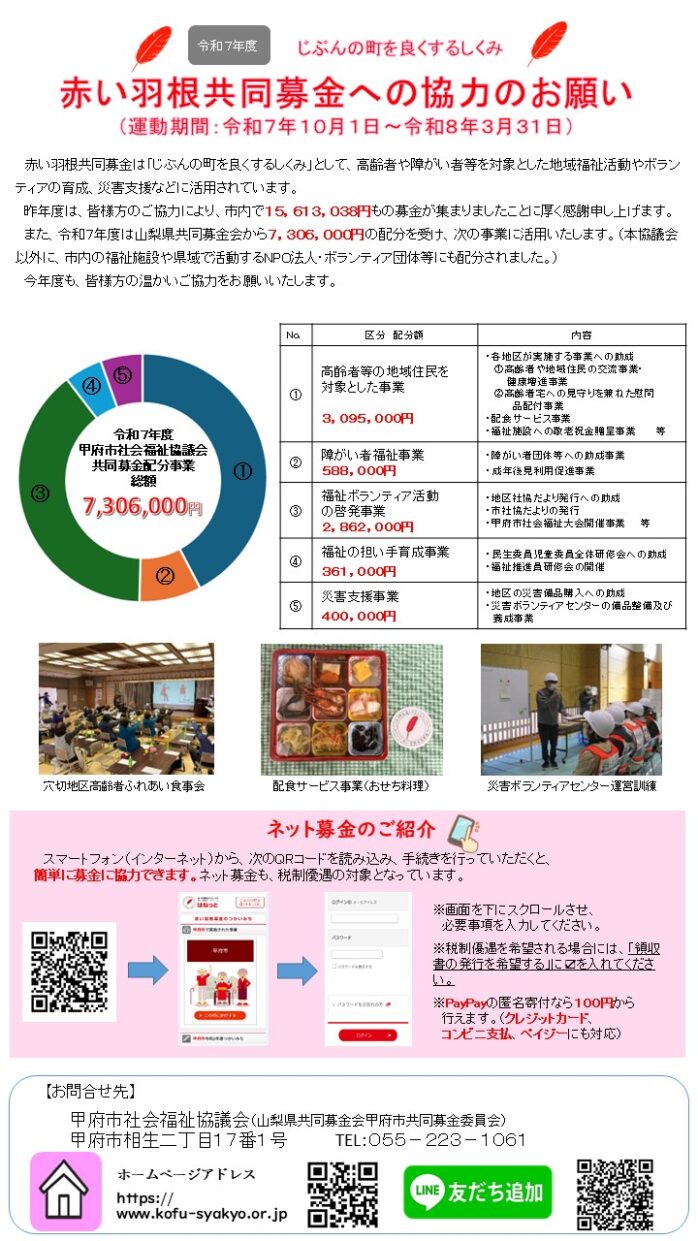 赤い羽根共同募金運動について 公開日:2025/09/26 今年度も10月1日から3月31日まで、「赤い羽根共同募金運動」が始まります。皆様の「たすけあい精神」に支えられる共同募金運動にご協力くださいますよう、よろしくお願い申し上げます。
